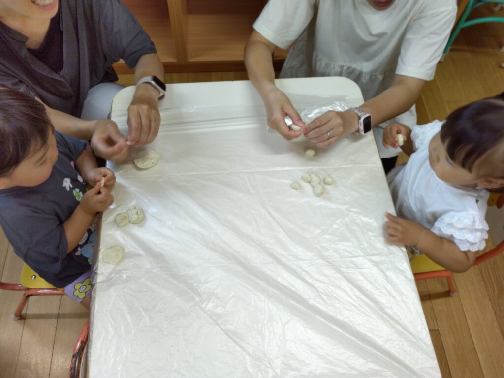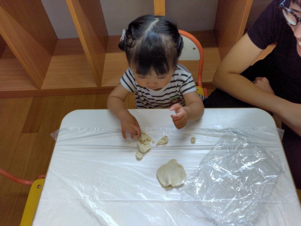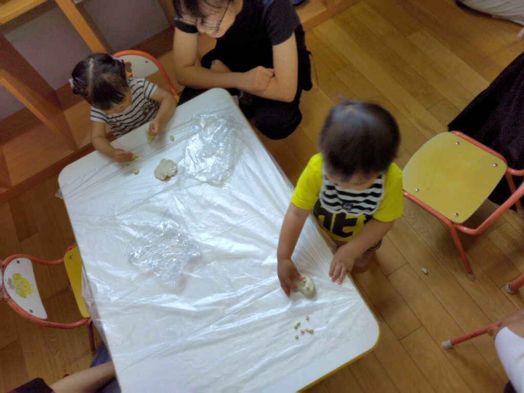 小麦粘土で遊んだグループでは、こねたりちぎったり丸めたりして感触を楽しみました。