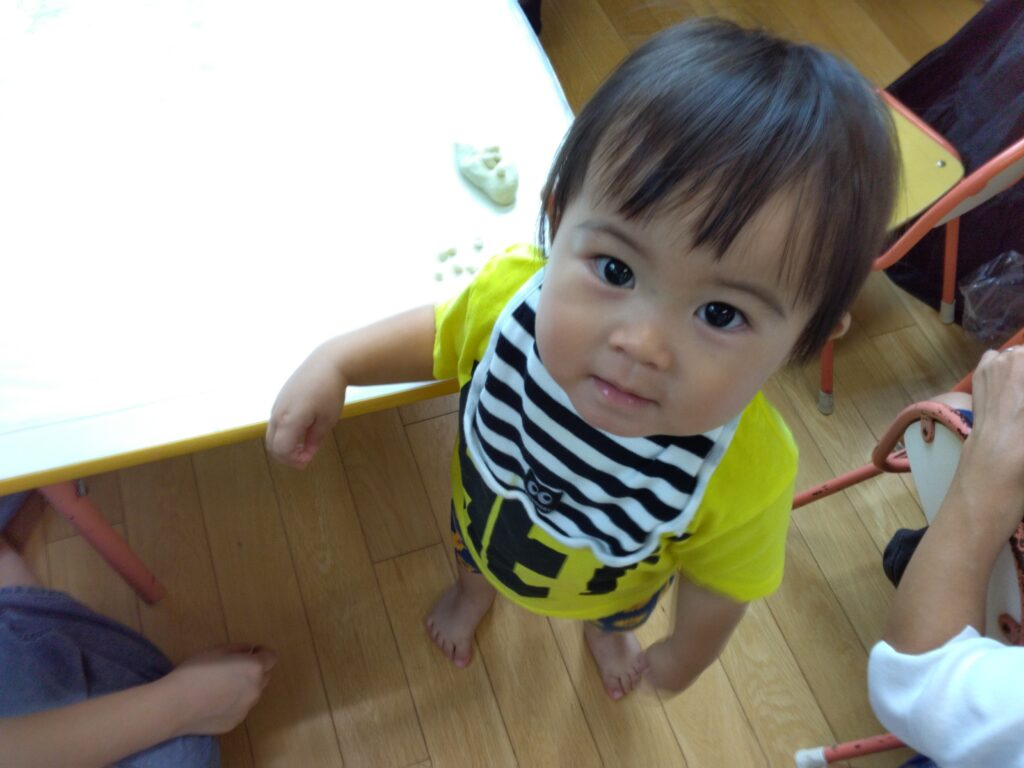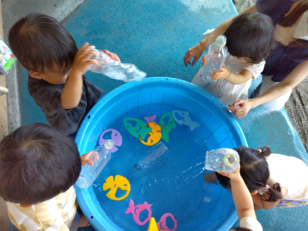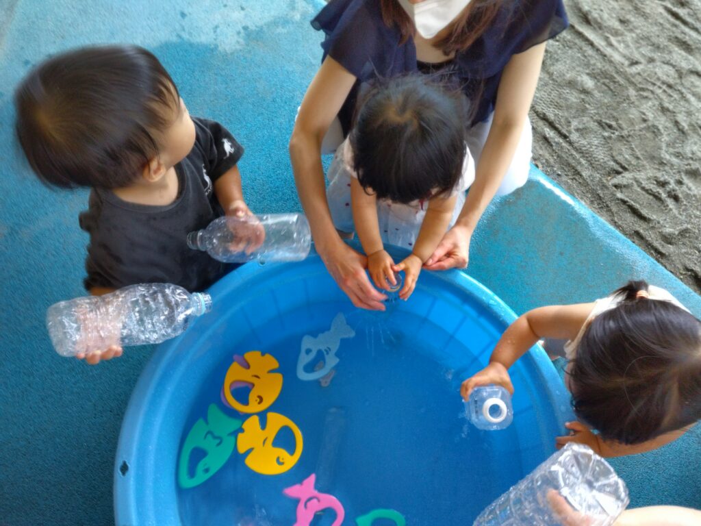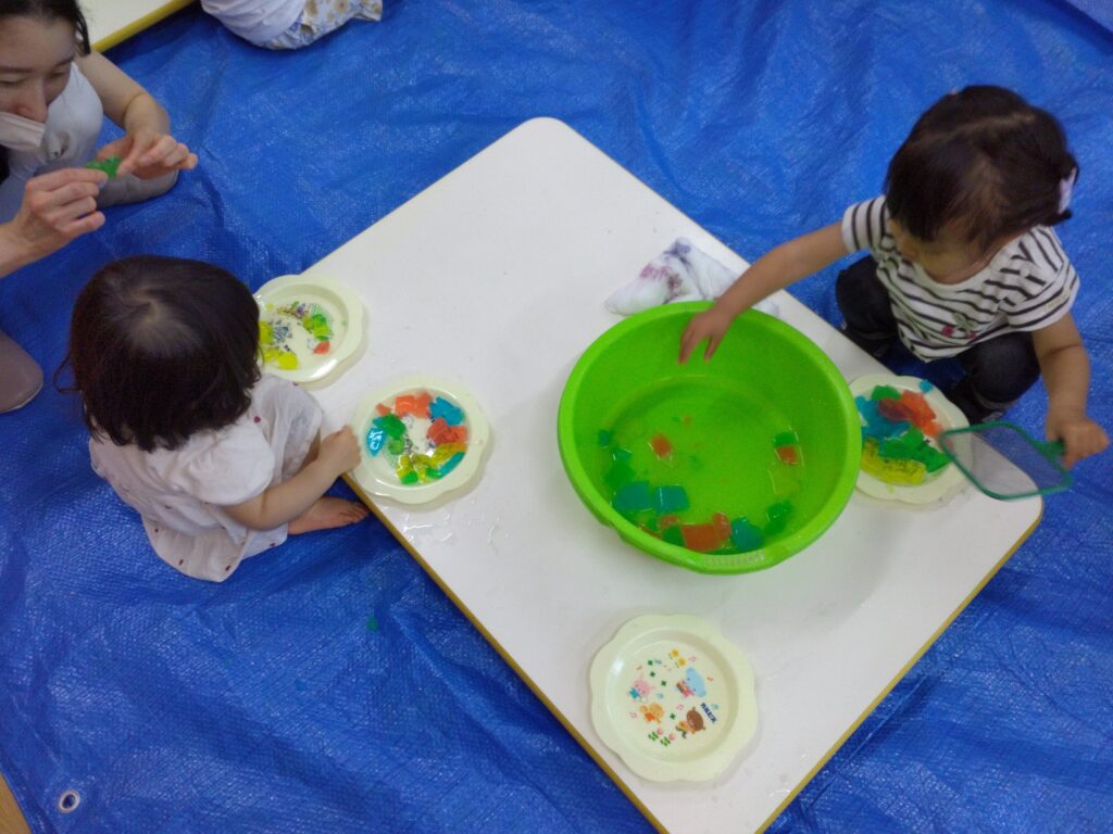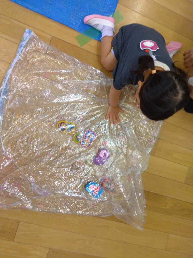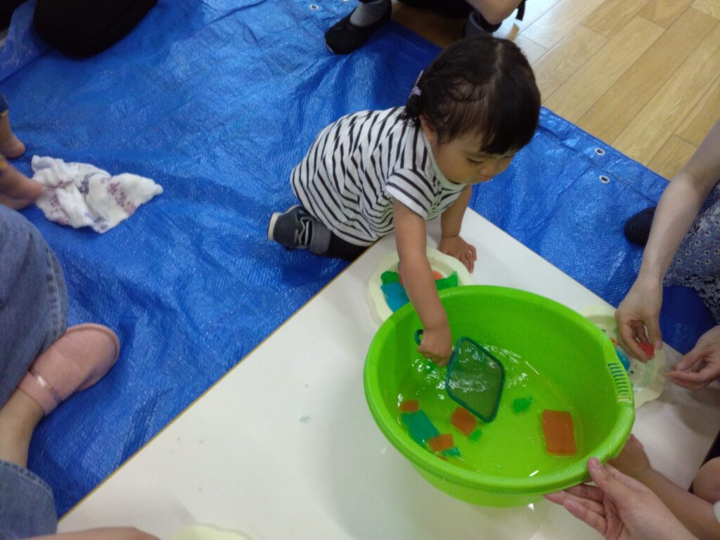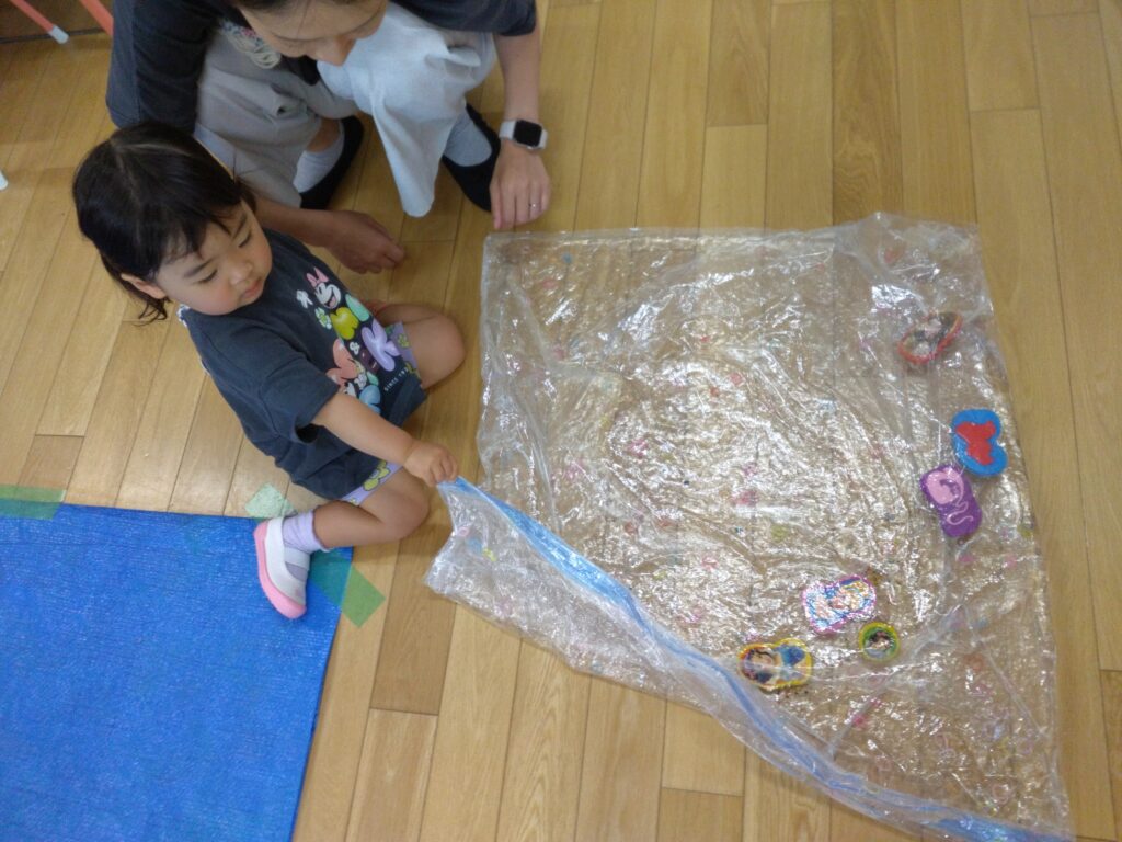0.1才のお友達は水を入れた袋の中に、寒天、キラキラテープ、ボタン等を入れて動く様子をよーく見たり、手をグーパーグーパーして触り心地を楽しんでいました。