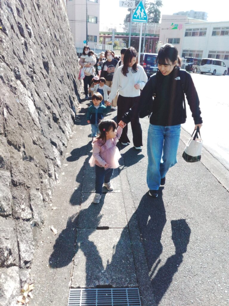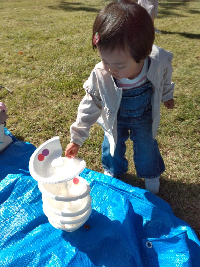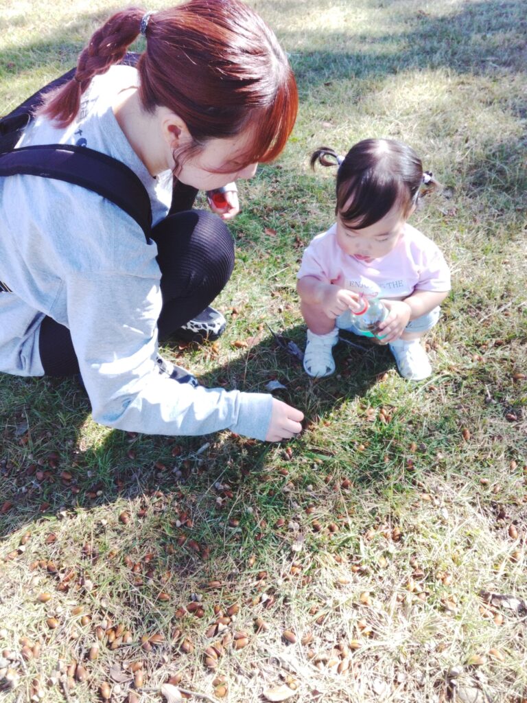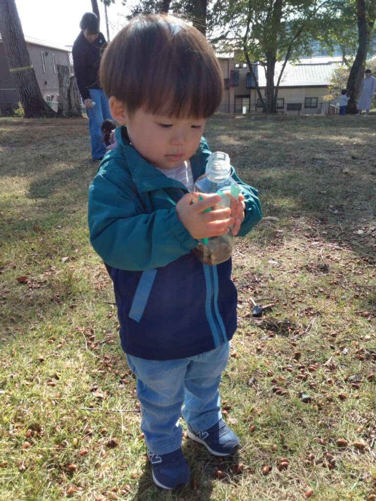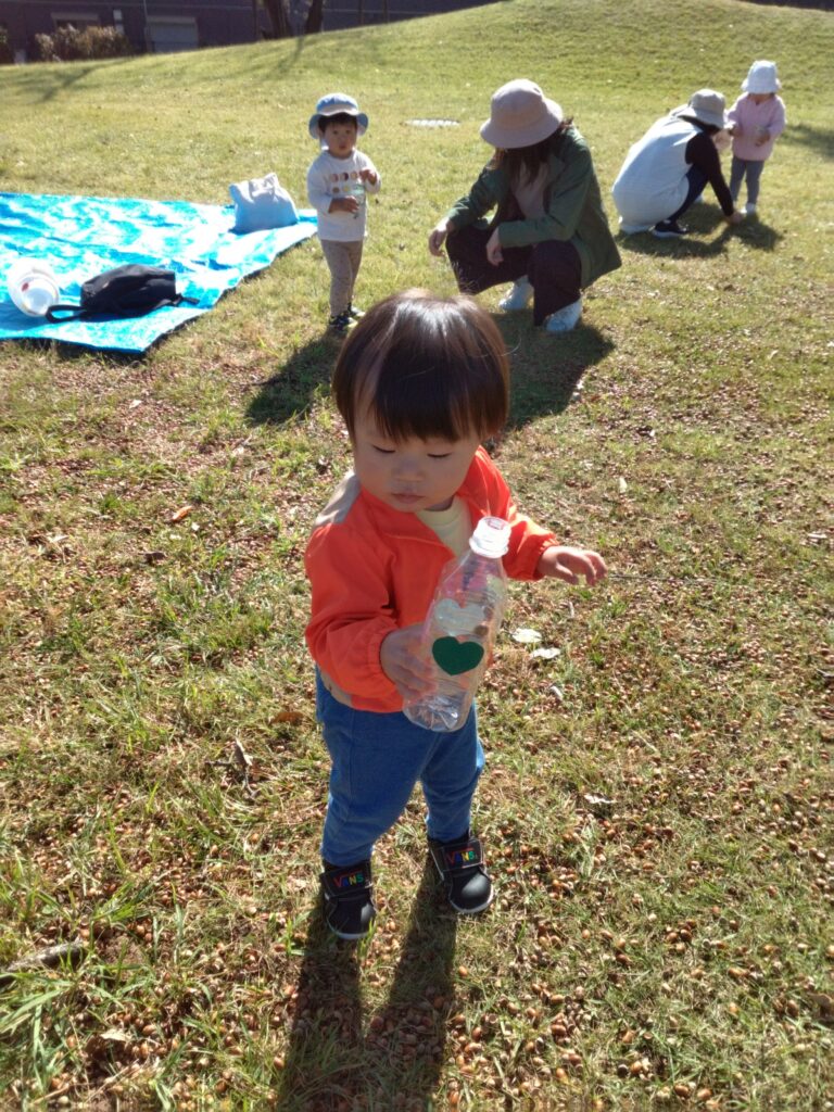 公園に着くとドングリがたくさん‼️ペットボトルの容器に集めて音を鳴らしてみたり、大きさを比べたり、どんぐりの帽子を探しているおともだちもいました。