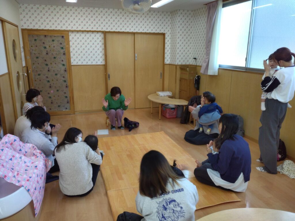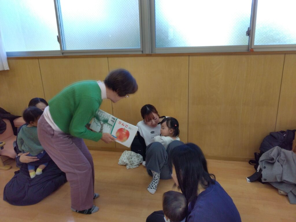 絵本を読んだりわらべ歌を歌って、おうちの方と触れ合いながら笑顔があふれる楽しい時間になりました。